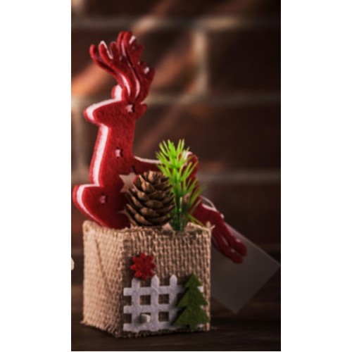 Новогоднее украшение: фигурка оленя на небольшой подставке, украшенная шишками и еловыми веточками. Будет прекрасно смотреться на столе и станет отличным дополнением к другим рождественским украшением. Фигурка оленя выполнена их пенополипропилена. Основание: картон, обтянутый холщовой тканью, украшено декором.