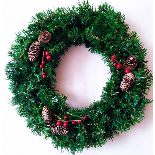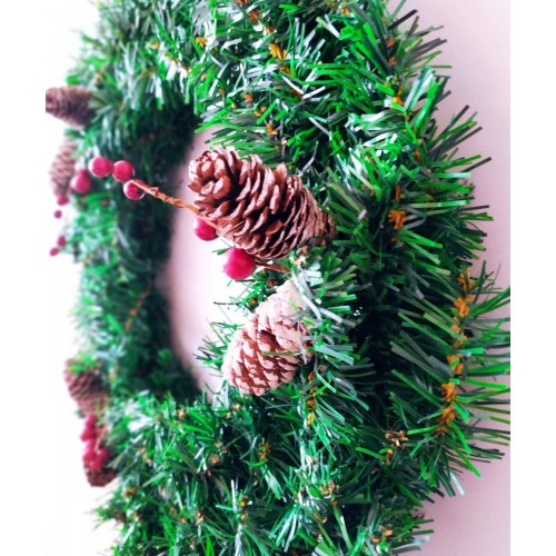 Полная иллюзия венка из натуральной ели. Венок украшен натуральными шишками и искусственными крансыми ягодами.